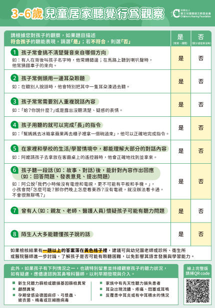 說明:1. 本檢核表由財團法人雅文兒童聽語文教基金會研發,提供家長觀察滿3歲至未滿7歲幼兒聽能表現之工 具,填寫後可取得聽能表現風險指數及相關衛教資源。2. 請優先使用線上檢核表,操作簡便,可即時取得結果與資源,網址:https://klip.chfn.org.tw/3. 如家庭使用數位工具有困難,可使用紙本檢核表。(如下圖)