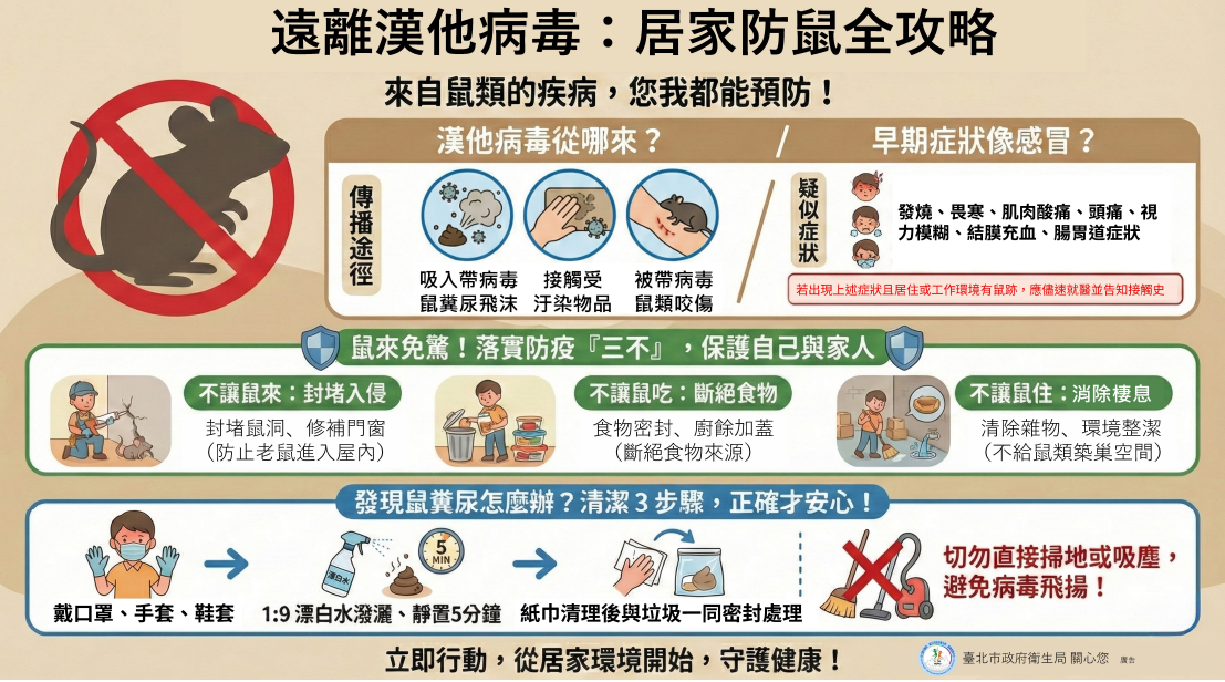 因應本市出現漢他病毒症候群病例,請落實環境整頓與防鼠防治作業,並加強環境衛生監督,以維護居家健康安全